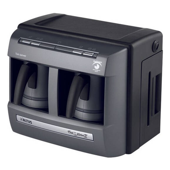 Altus Kahve Makinesi ikili ürünü, antrasit gri rengiyle şık bir tasarıma sahiptir. Koyu gri renkteki cihazda, önemli bir özellik olan damlama emniyeti vardır. Bu sayede güvenli bir kullanım sunar. Su haznesine gerekli miktarda suyu ekleyip, cezve kısmına yalnızca kahve koymanız yeterlidir. Altus Kahve Makinesi ikili cezvenin tam ortasında kahve fincanlarının olduğu minik ikonlar vardır. Yapacağınız adede göre 1 veya 2 fincan seçeneğini buradan işaretleyebilirsiniz. Tuşa bastıktan sonra cihaz çalışıp kahveyi hazırlamaya başlar. Kahve makinesi 2 li ile aynı anda dört kişi kahvenizi yudumlayabilirsiniz.