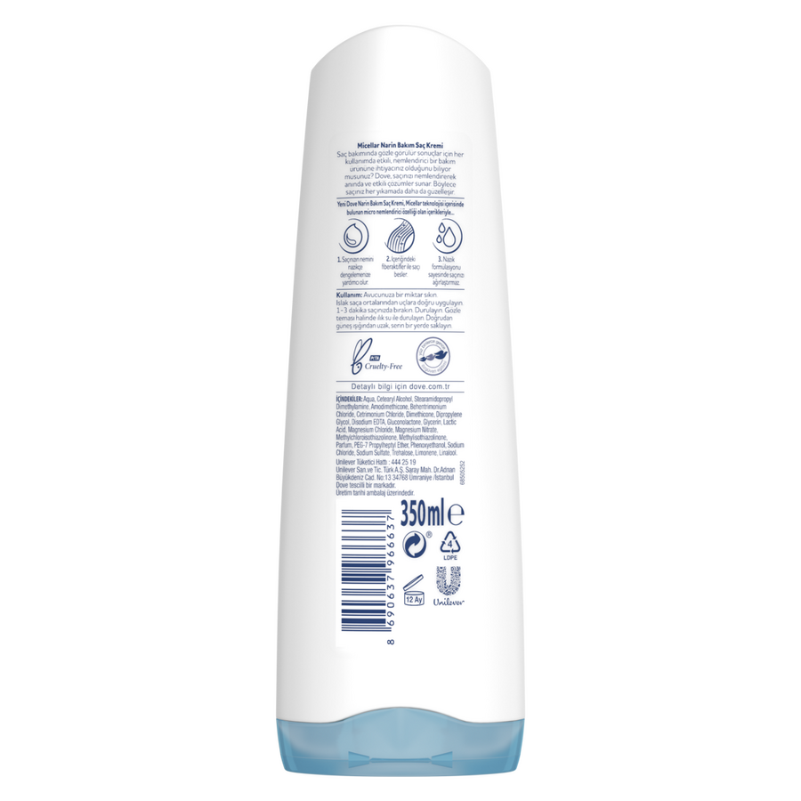 Dove Micellar Narin Bakım Saç Kremi, saçların ihtiyaç duyduğu özenli bakımı sağlamak için tasarlanmış, 350 ml boyutunda bir saç bakım ürünüdür. Hassas saç derisi ve kırılgan saçlar için özel olarak geliştirilmiş bu krem, micellar teknolojisi ile zenginleştirilmiştir, saçları derinlemesine temizlerken aynı zamanda nazikçe nemlendirir.