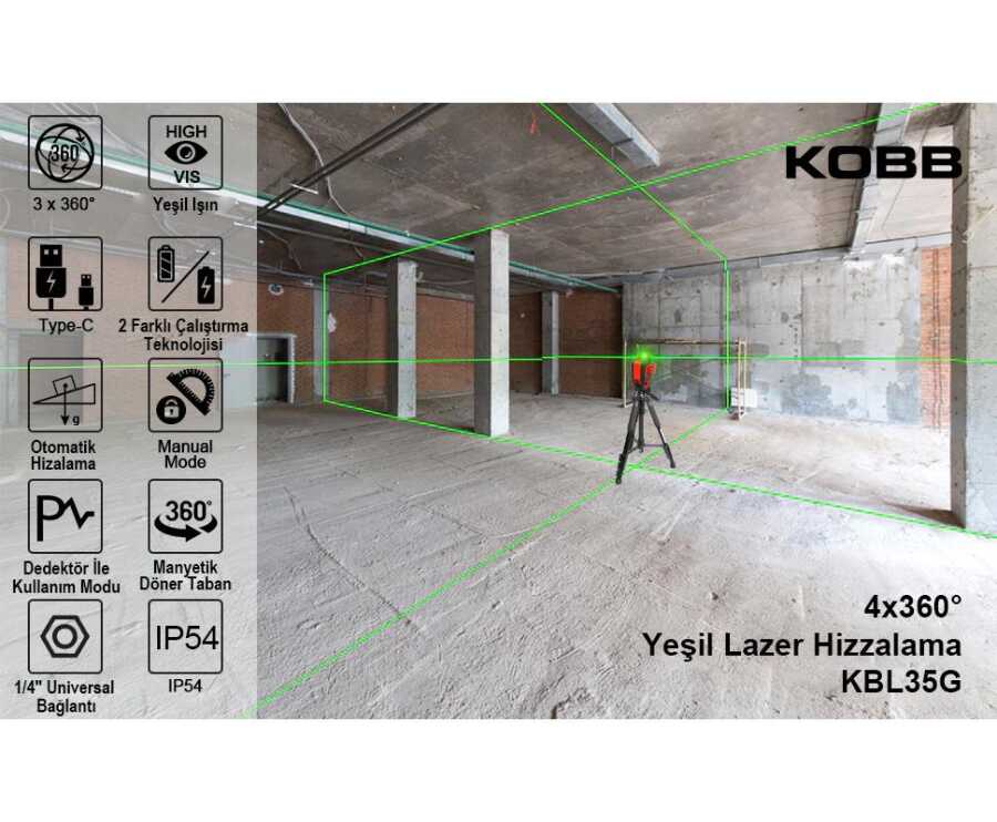 ·         KOBB KBL35G Profesyonel Li-ion Şarjlı 4X360⁰ Otomatik Hizalamalı Yeşil Çapraz Çizgi Lazer Distomat + Uzaktan Kumanda