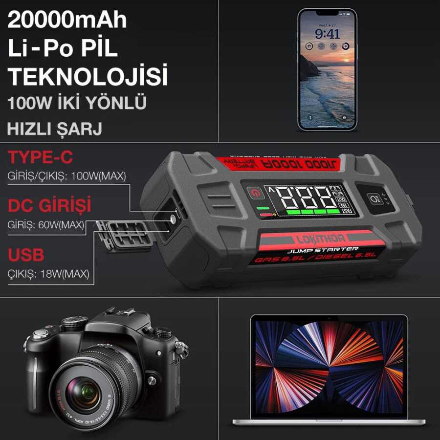 · Lokithor J1000 12V 1000Amp LiFePO4 Akıllı Akü Takviye + Powerbank + Led Lamba