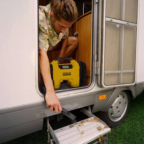 Dahili 18Volt Li-ion Stanley akü sayesinde dağcılık, kamp, piknik, spor aktiviteleri, sahil, plaj gibi elektriğin olmadığı açık alanlarda kablosuz olarak lastik, top, deniz topu vs. şişirme imkânı sağlar.