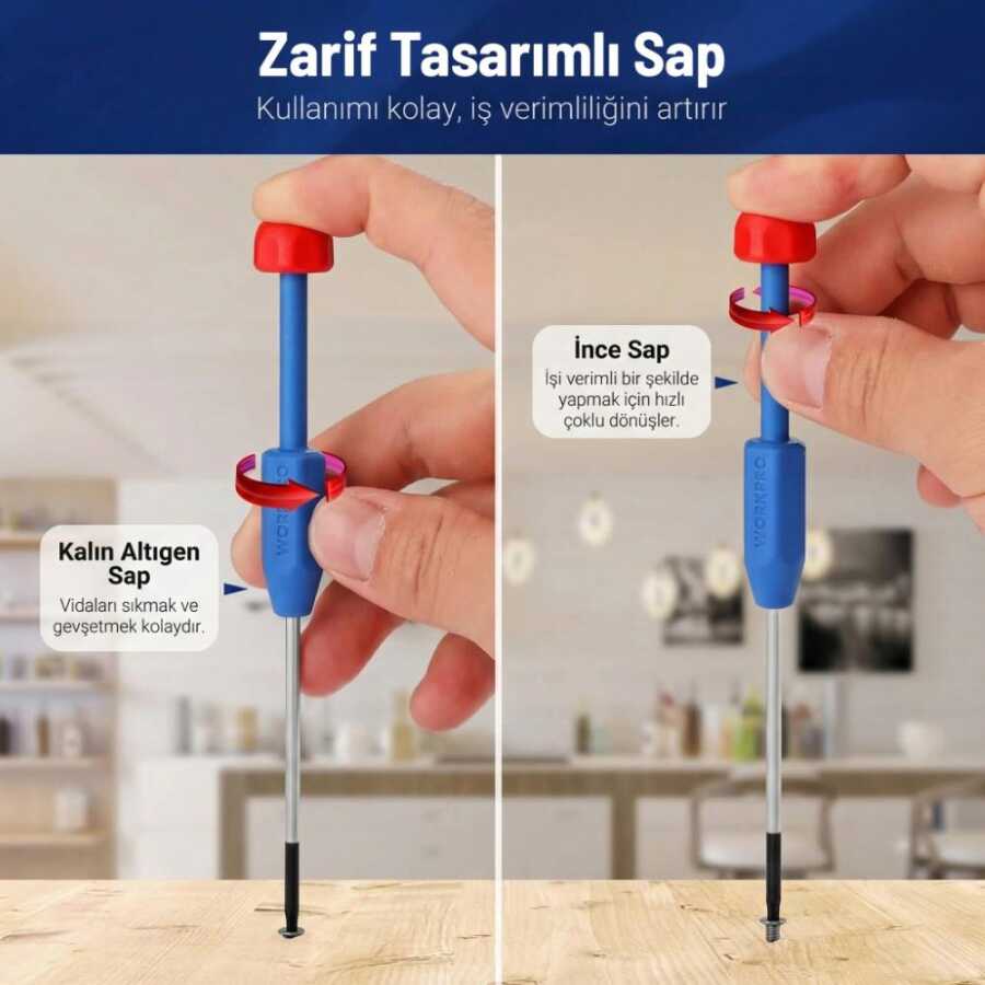 • Tepe noktasına entegre avuç içinde döner renklendirilmiş başlıklar sayesinde hassas vidalama yaparken avuç içini acıtmaz, üstün kontrol sağlar.