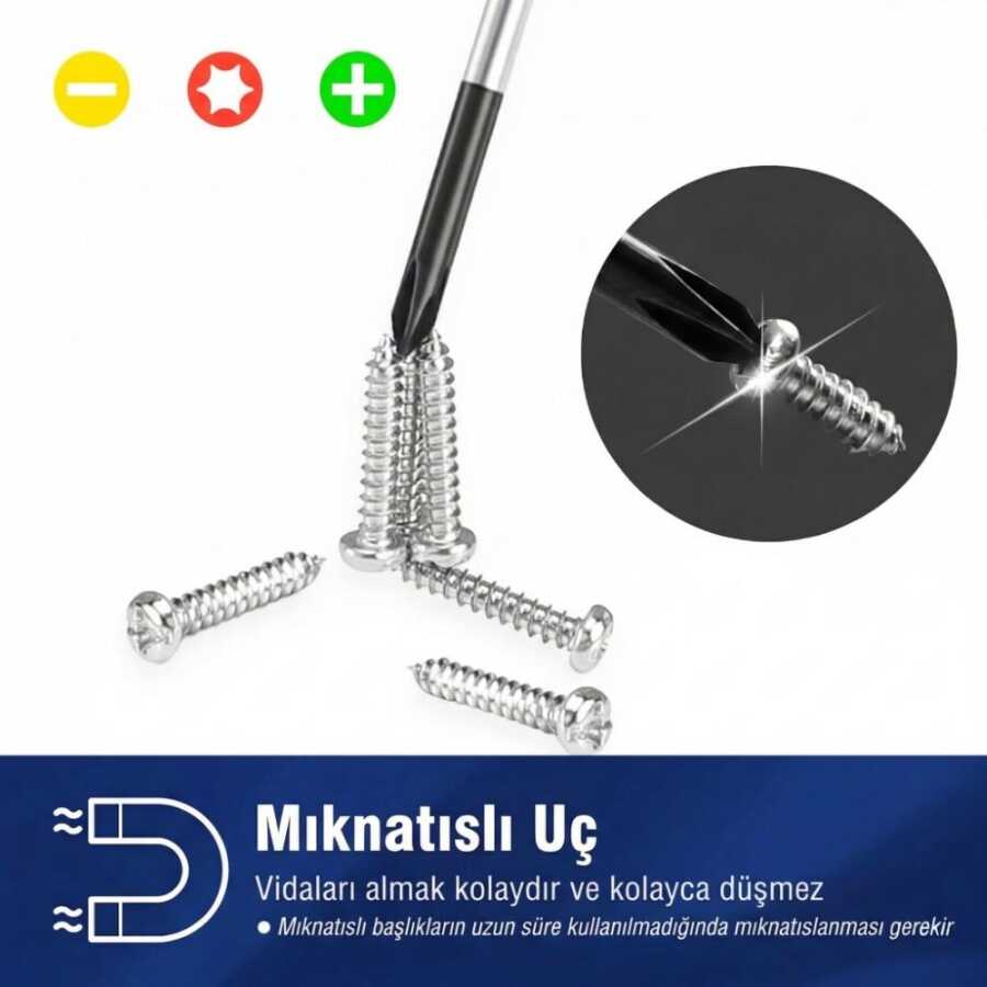 • Mekanik veya elektrikli aletlerin bakım ve onarımında, profesyonel olarak kullanılabilmesi için paslanmaya ve aşınmaya dayanıklı Manyetik Krom Vanadium vidalama uçlarına sahiptir.