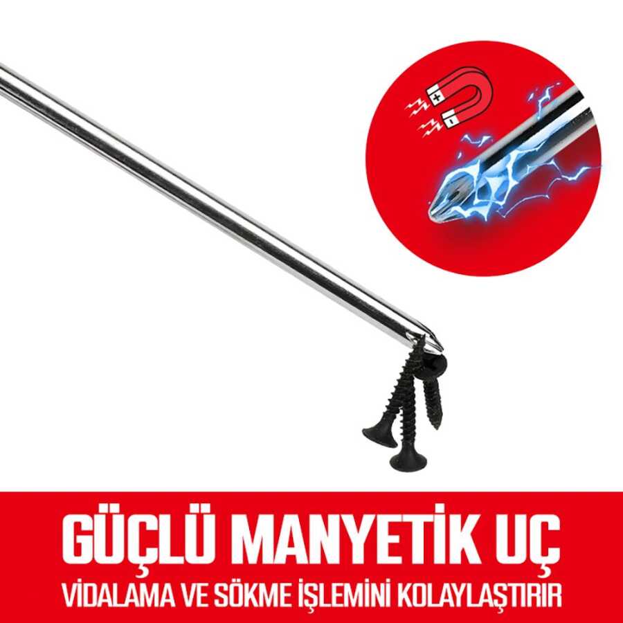• Mekanik veya elektrikli aletlerin bakım ve onarımında, profesyonel olarak kullanılabilmesi için paslanmaya ve aşınmaya dayanıklı Manyetik Krom Vanadyum vidalama uçlarına sahiptir.