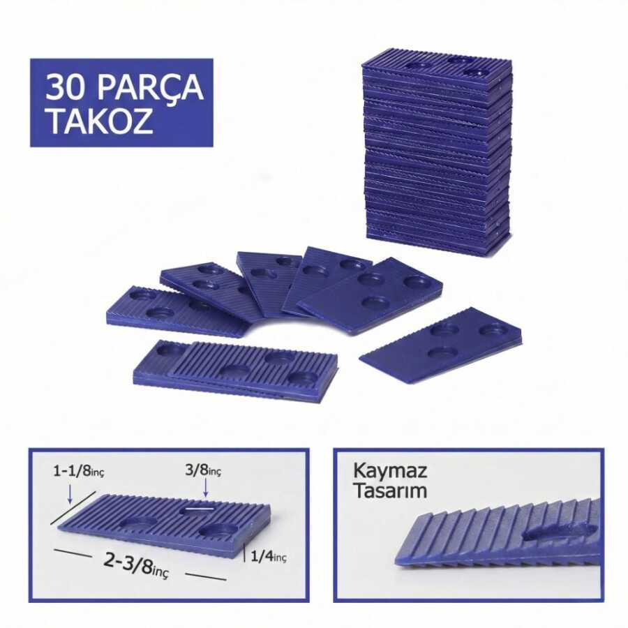• Laminant, Parke, Vinil, Lambri gibi ahşap zemin ve duvar döşeme işlerinde birbirine geçmeli parçaların zarar vermeden ve boşluk bırakmadan sıkıştırılarak sabitlenmesinde, duvar kenarlarına yakın zemin döşeme işlemlerinde zorlanmadan montaj yapabilmenizi sağlayan tokmak, çelik çektirme çubuğu, parke takozu ve seviyeleme takozundan oluşan 33 parçalı zemin döşeme kurulum seti/kiti.