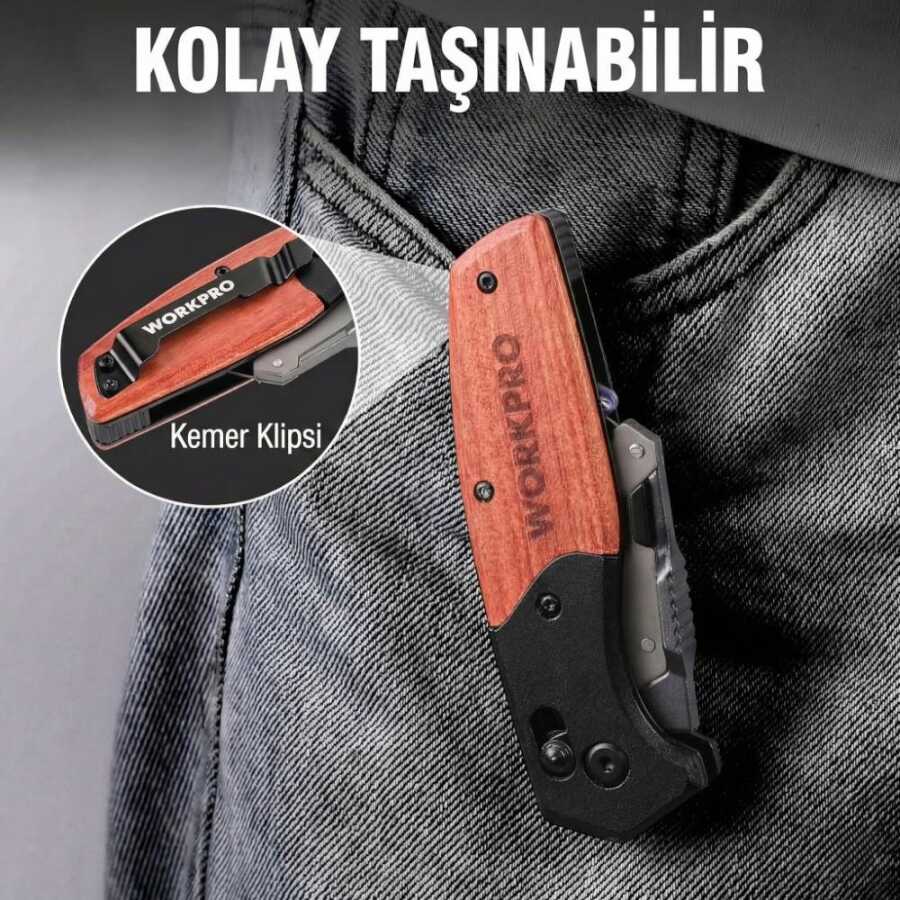• WORKPRO WP211035 Ağır Hizmet Çelik/Ahşap Gövde Katlanır Rötuş Maket Bıçağı + 11 Adet Yedek Bıçak