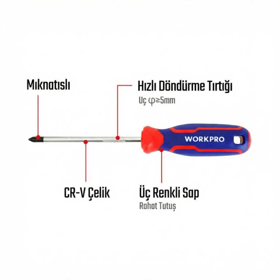 • WORKPRO WP221037 PZ2x100mm CR-V Manyetik Profesyonel Yıldız Tornavida