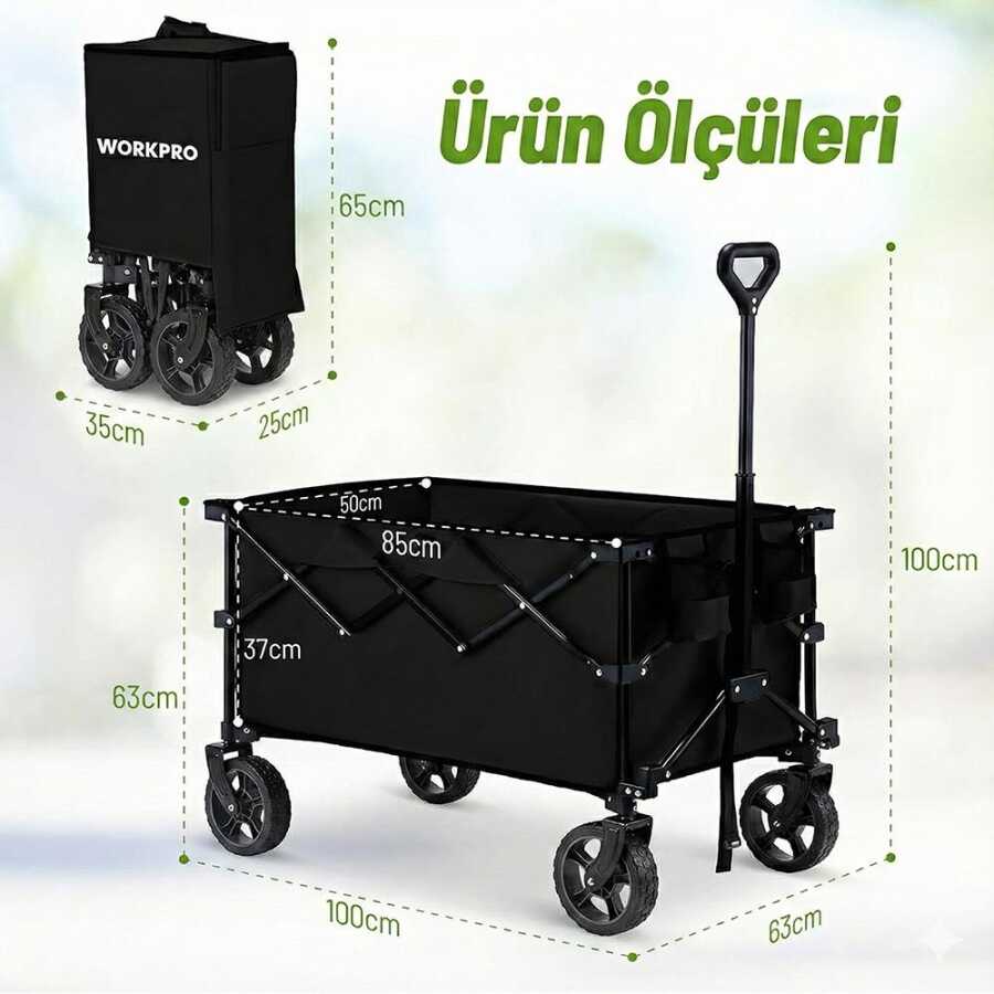 • Alışveriş arabası olarak kullanılmasının yanı sıra plaj, park, kamp, açık hava spor etkinlikleri, top veya ekipman taşıma, bahçe eşyaları ve malzemeleri taşımak için dayanıklı 600D Polyester kumaş ve çelik akordiyon gövdeden üretilmiştir.